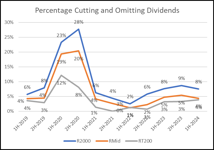 - The numbers are small, but cuts and omissions declined a little for small caps and mid caps but rose for large caps. Most of the reductions for the companies in the Russell Top 200 arose from variable dividend policies at natural resource companies. Lower oil prices led to lower payouts at ConocoPhillips and Pioneer Natural Resources, for example. This had a smaller impact in the Russell 2000 and the Russell Midcap indexes